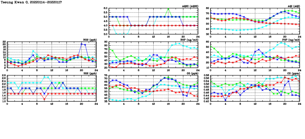| Air Quality Data Time Series in Tseung Kwan O (2022/01/17) | ( Line colors: Day -3 Day -2 Day -1 Current day ) | 2D Map Current AQHI |