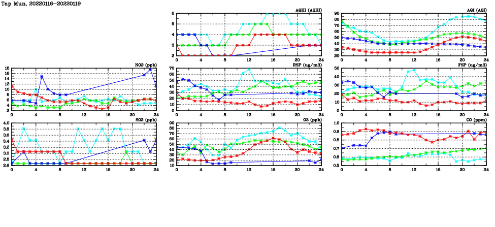 | Air Quality Data Time Series in Tap Mun (2022/01/19) | ( Line colors: Day -3 Day -2 Day -1 Current day ) | 2D Map Current AQHI |