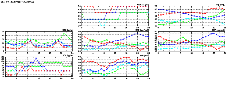 | Air Quality Data Time Series in Tai Po (2022/01/15) | ( Line colors: Day -3 Day -2 Day -1 Current day ) | 2D Map Current AQHI |