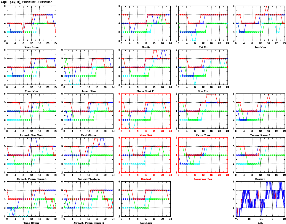 | Air Quality Data Time Series for AQHI (2022/01/15) | ( Line colors: Day -3 Day -2 Day -1 Current day ) | 2D Map Current AQHI |