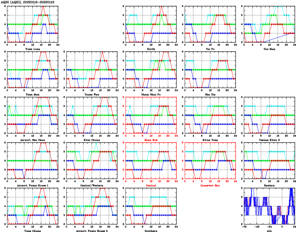 | Air Quality Data Time Series for AQHI (2022/01/19) | ( Line colors: Day -3 Day -2 Day -1 Current day ) | 2D Map Current AQHI |