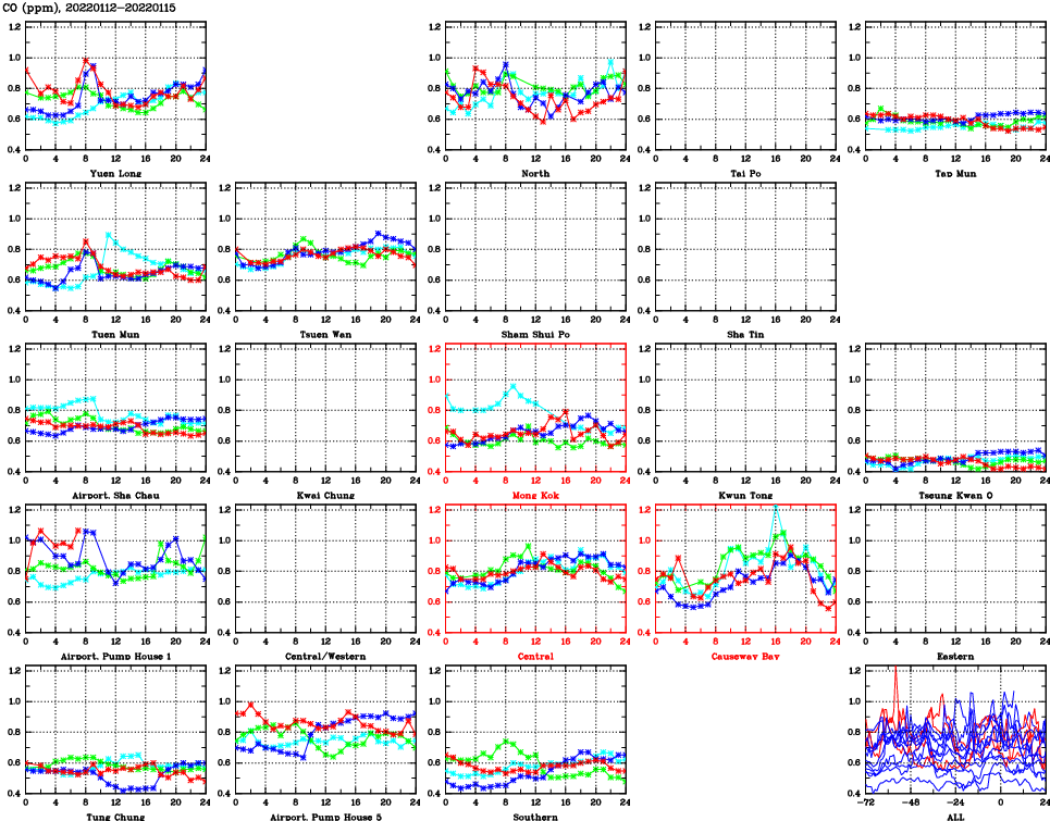 | Air Quality Data Time Series for CO (2022/01/15) | ( Line colors: Day -3 Day -2 Day -1 Current day ) | 2D Map Current AQHI |