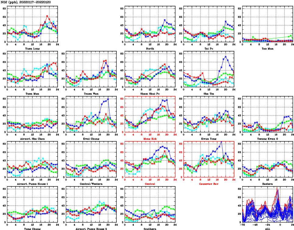 | Air Quality Data Time Series for NO2 (2022/01/20) | ( Line colors: Day -3 Day -2 Day -1 Current day ) | 2D Map Current AQHI |