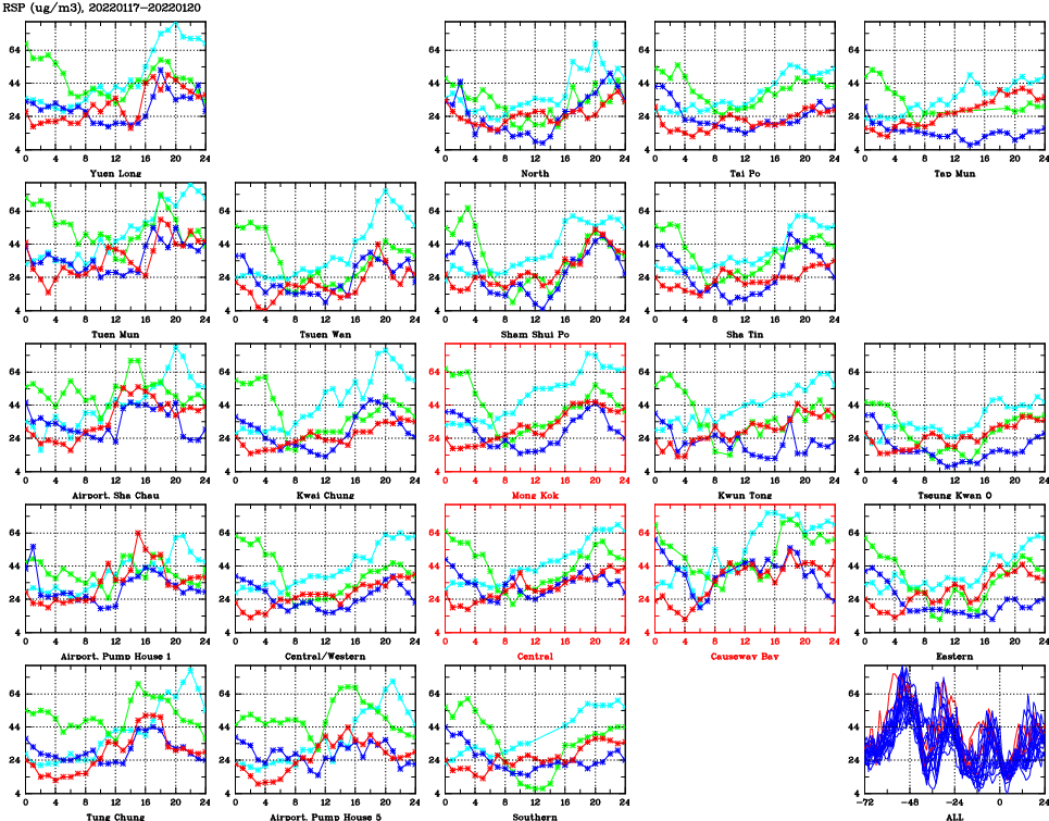 | Air Quality Data Time Series for RSP (2022/01/20) | ( Line colors: Day -3 Day -2 Day -1 Current day ) | 2D Map Current AQHI |