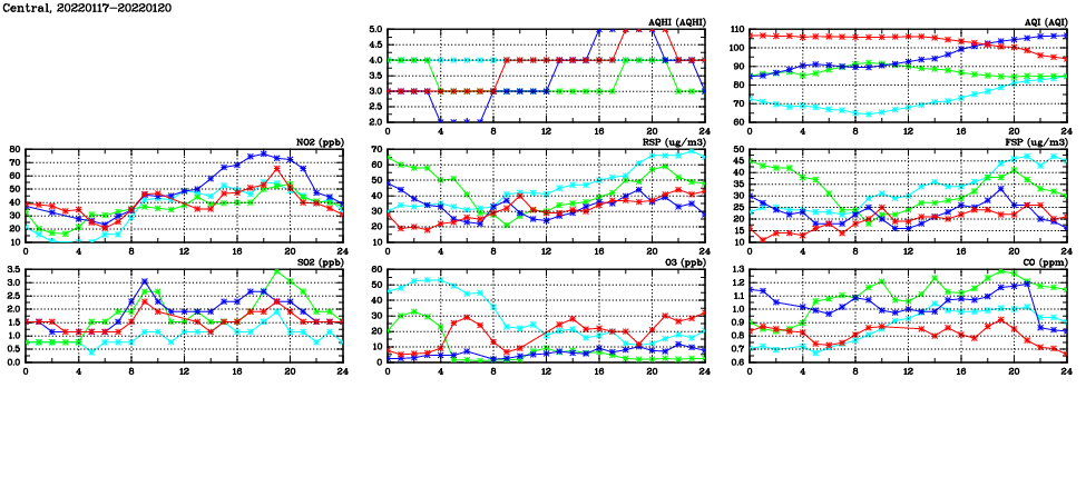 | Air Quality Data Time Series in Central (2022/01/20) | ( Line colors: Day -3 Day -2 Day -1 Current day ) | 2D Map Current AQHI |