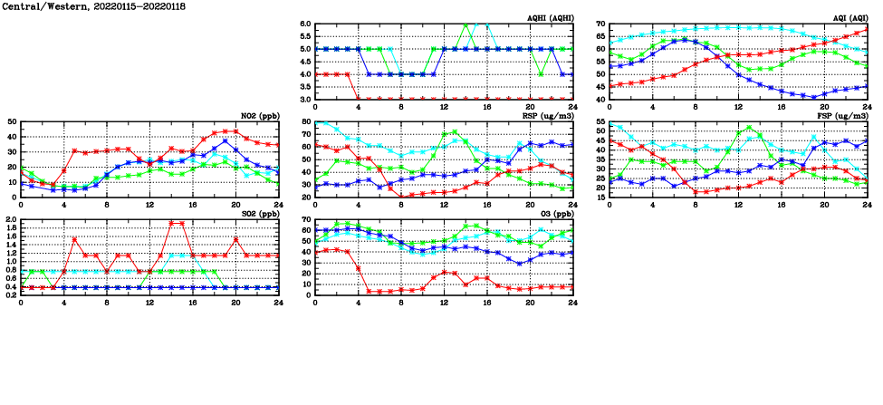| Air Quality Data Time Series in Central/Western (2022/01/18) | ( Line colors: Day -3 Day -2 Day -1 Current day ) | 2D Map Current AQHI |