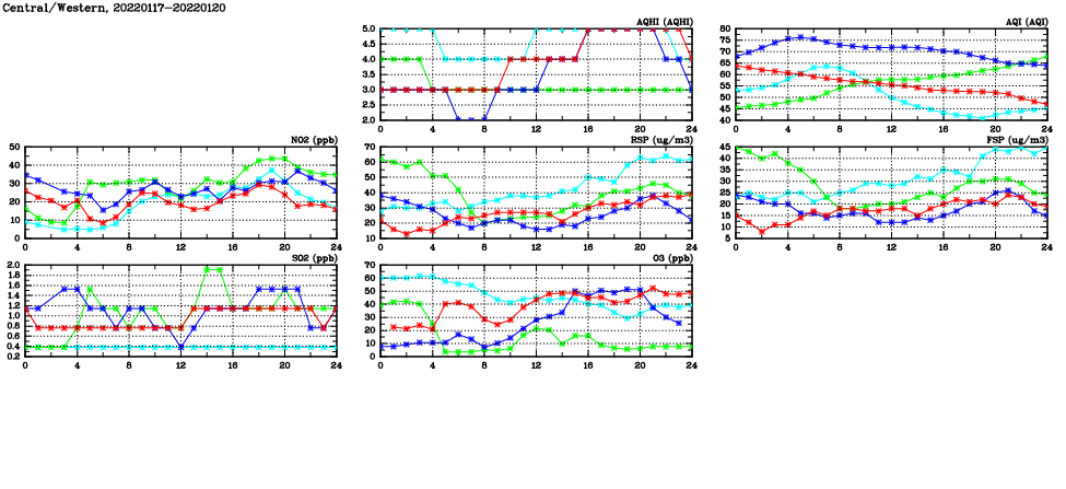 | Air Quality Data Time Series in Central/Western (2022/01/20) | ( Line colors: Day -3 Day -2 Day -1 Current day ) | 2D Map Current AQHI |