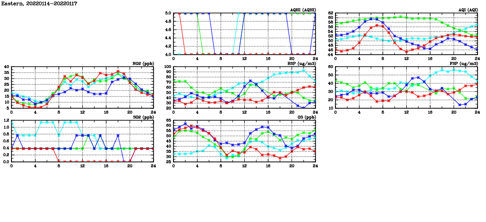 | Air Quality Data Time Series in Eastern (2022/01/17) | ( Line colors: Day -3 Day -2 Day -1 Current day ) | 2D Map Current AQHI |