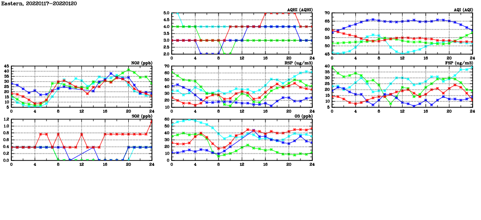 | Air Quality Data Time Series in Eastern (2022/01/20) | ( Line colors: Day -3 Day -2 Day -1 Current day ) | 2D Map Current AQHI |