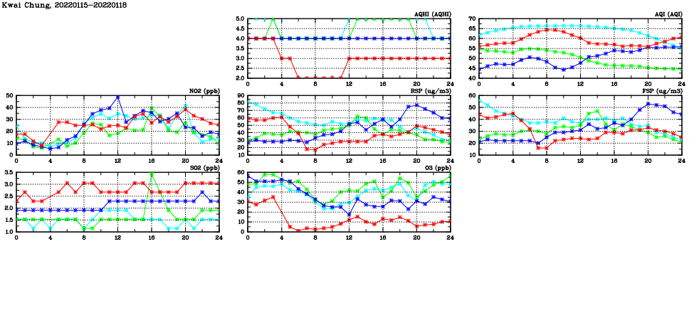 | Air Quality Data Time Series in Kwai Chung (2022/01/18) | ( Line colors: Day -3 Day -2 Day -1 Current day ) | 2D Map Current AQHI |