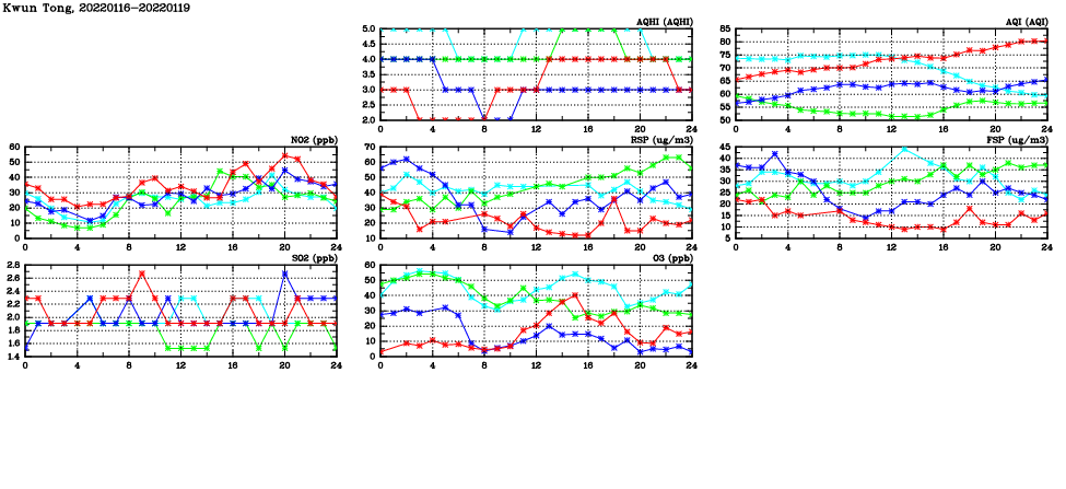 | Air Quality Data Time Series in Kwun Tong (2022/01/19) | ( Line colors: Day -3 Day -2 Day -1 Current day ) | 2D Map Current AQHI |