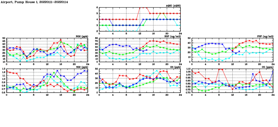 | Air Quality Data Time Series in Airport, Pump House 1 (2022/01/14) | ( Line colors: Day -3 Day -2 Day -1 Current day ) | 2D Map Current AQHI |