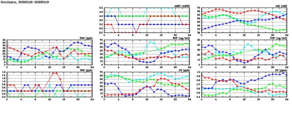 | Air Quality Data Time Series in Southern (2022/01/19) | ( Line colors: Day -3 Day -2 Day -1 Current day ) | 2D Map Current AQHI |