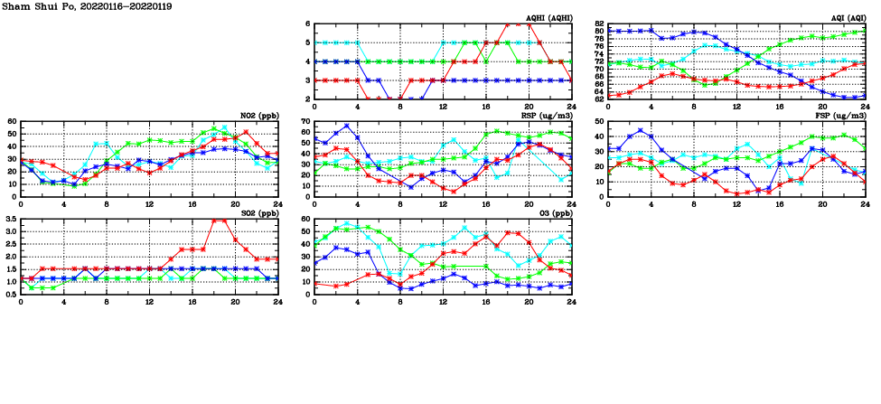 | Air Quality Data Time Series in Sham Shui Po (2022/01/19) | ( Line colors: Day -3 Day -2 Day -1 Current day ) | 2D Map Current AQHI |