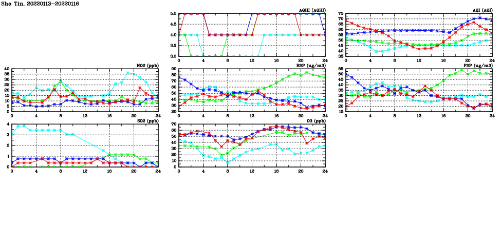 | Air Quality Data Time Series in Sha Tin (2022/01/16) | ( Line colors: Day -3 Day -2 Day -1 Current day ) | 2D Map Current AQHI |