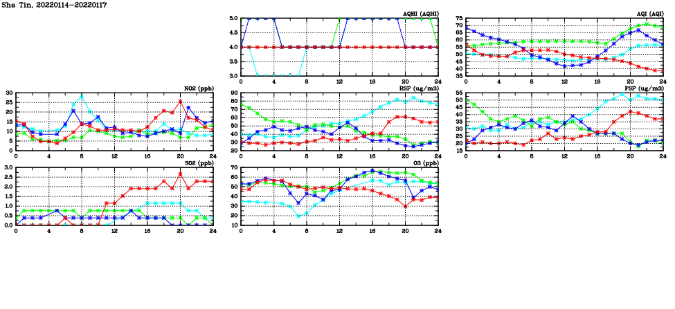 | Air Quality Data Time Series in Sha Tin (2022/01/17) | ( Line colors: Day -3 Day -2 Day -1 Current day ) | 2D Map Current AQHI |