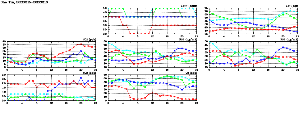 | Air Quality Data Time Series in Sha Tin (2022/01/18) | ( Line colors: Day -3 Day -2 Day -1 Current day ) | 2D Map Current AQHI |