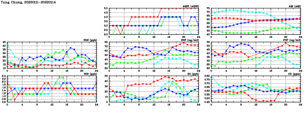 | Air Quality Data Time Series in Tung Chung (2022/01/14) | ( Line colors: Day -3 Day -2 Day -1 Current day ) | 2D Map Current AQHI |