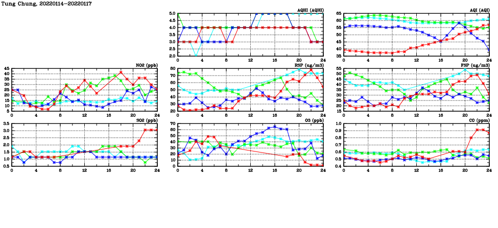 | Air Quality Data Time Series in Tung Chung (2022/01/17) | ( Line colors: Day -3 Day -2 Day -1 Current day ) | 2D Map Current AQHI |