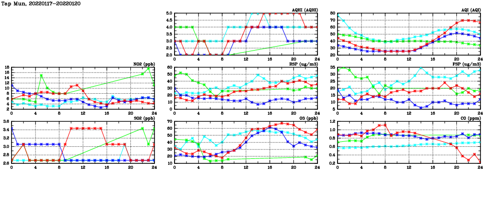 | Air Quality Data Time Series in Tap Mun (2022/01/20) | ( Line colors: Day -3 Day -2 Day -1 Current day ) | 2D Map Current AQHI |