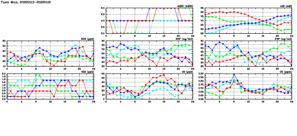 | Air Quality Data Time Series in Tuen Mun (2022/01/16) | ( Line colors: Day -3 Day -2 Day -1 Current day ) | 2D Map Current AQHI |