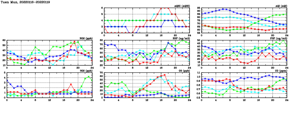 | Air Quality Data Time Series in Tuen Mun (2022/01/19) | ( Line colors: Day -3 Day -2 Day -1 Current day ) | 2D Map Current AQHI |
