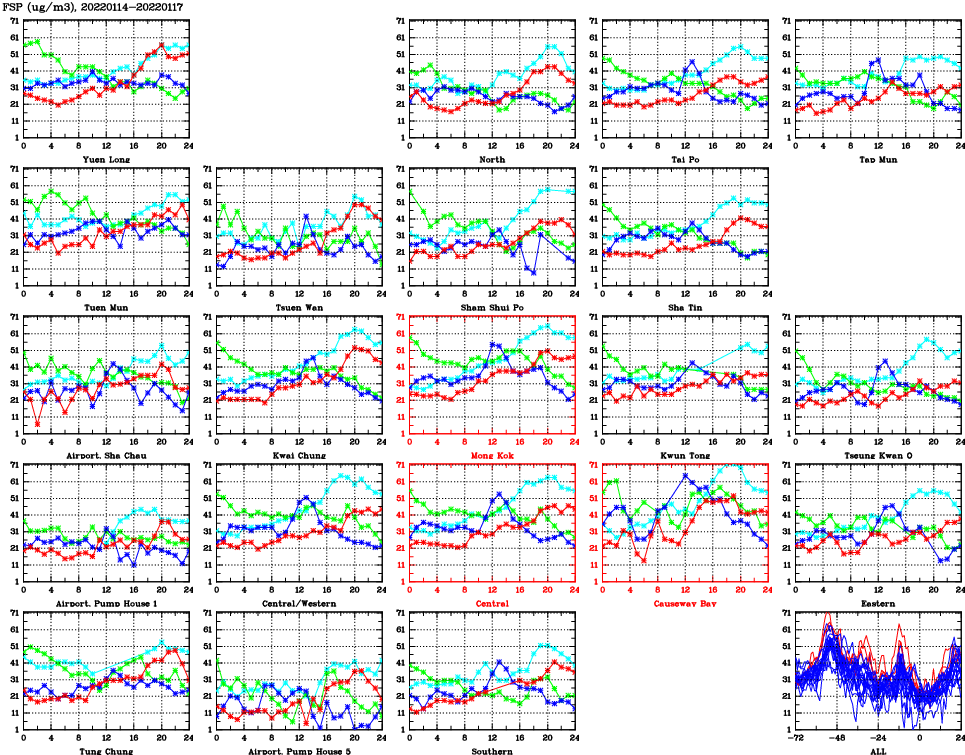 | Air Quality Data Time Series for FSP (2022/01/17) | ( Line colors: Day -3 Day -2 Day -1 Current day ) | 2D Map Current AQHI |