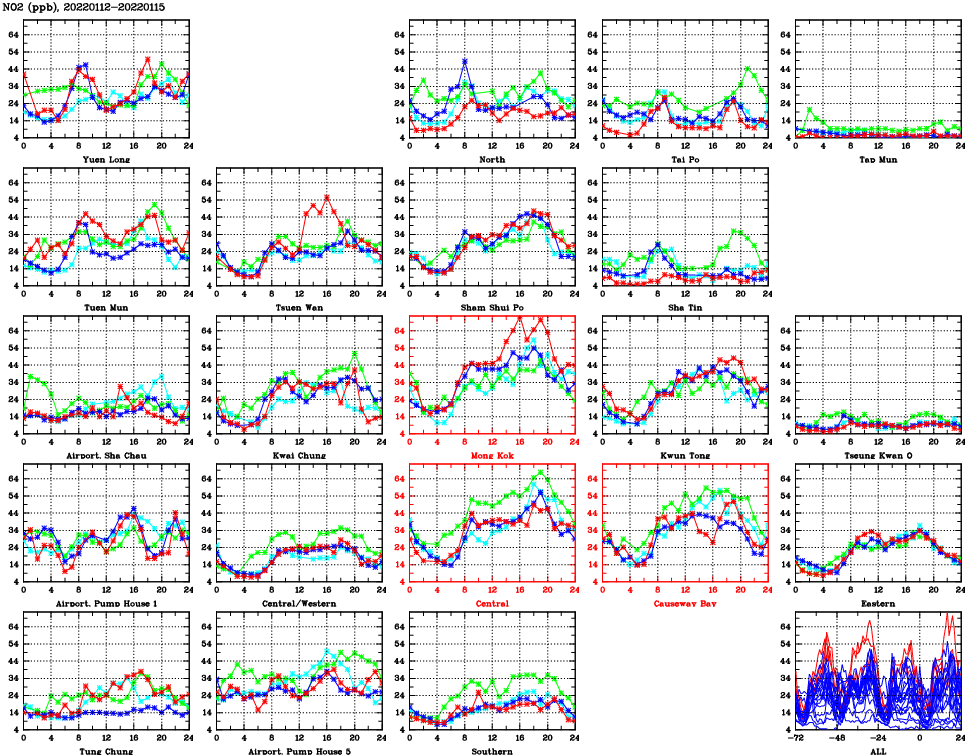 | Air Quality Data Time Series for NO2 (2022/01/15) | ( Line colors: Day -3 Day -2 Day -1 Current day ) | 2D Map Current AQHI |