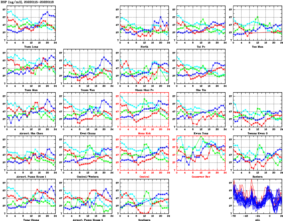 | Air Quality Data Time Series for RSP (2022/01/18) | ( Line colors: Day -3 Day -2 Day -1 Current day ) | 2D Map Current AQHI |