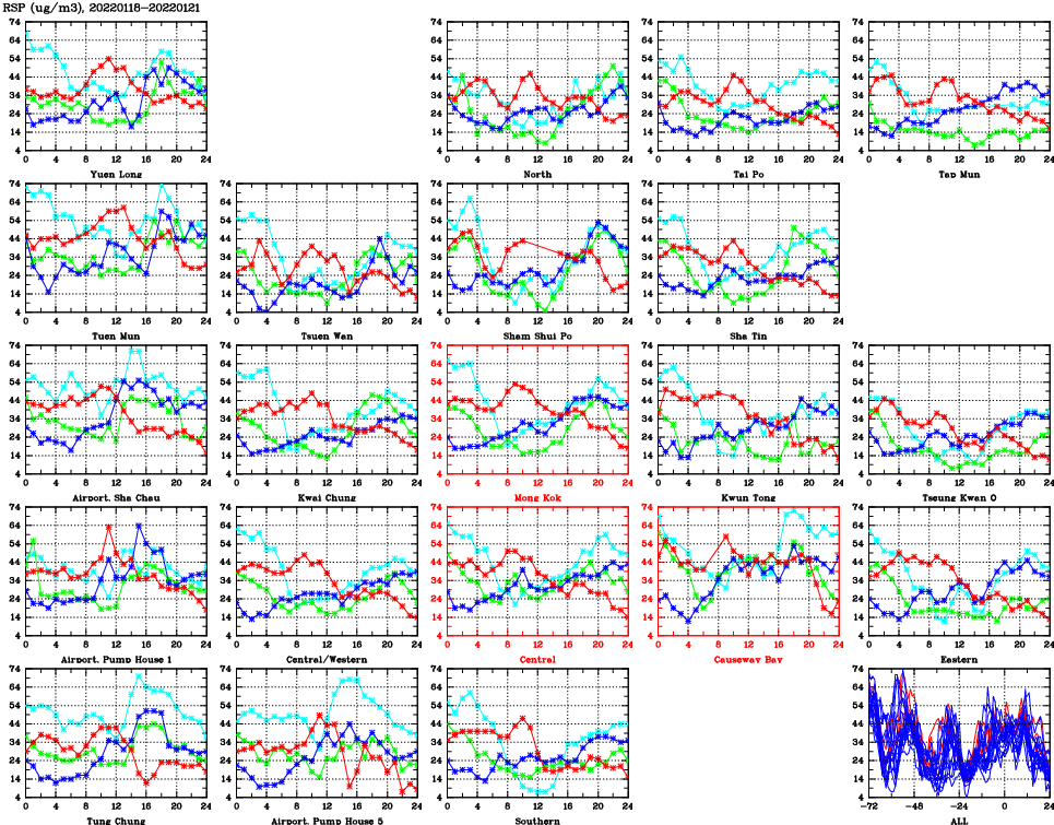| Air Quality Data Time Series for RSP (2022/01/21) | ( Line colors: Day -3 Day -2 Day -1 Current day ) | 2D Map Current AQHI |