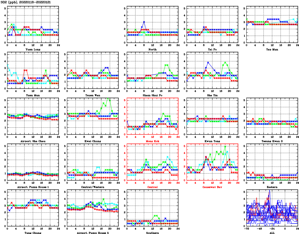 | Air Quality Data Time Series for SO2 (2022/01/21) | ( Line colors: Day -3 Day -2 Day -1 Current day ) | 2D Map Current AQHI |
