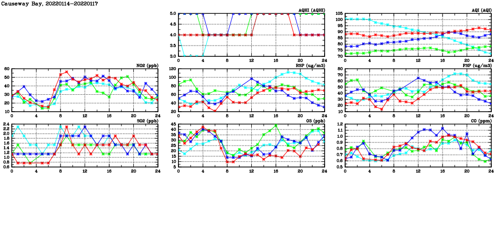 | Air Quality Data Time Series in Causeway Bay (2022/01/17) | ( Line colors: Day -3 Day -2 Day -1 Current day ) | 2D Map Current AQHI |