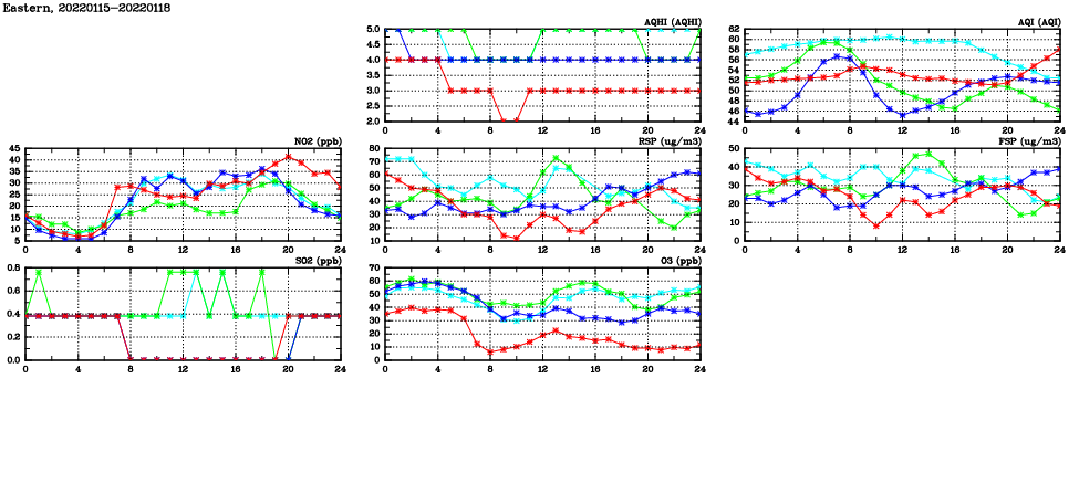 | Air Quality Data Time Series in Eastern (2022/01/18) | ( Line colors: Day -3 Day -2 Day -1 Current day ) | 2D Map Current AQHI |