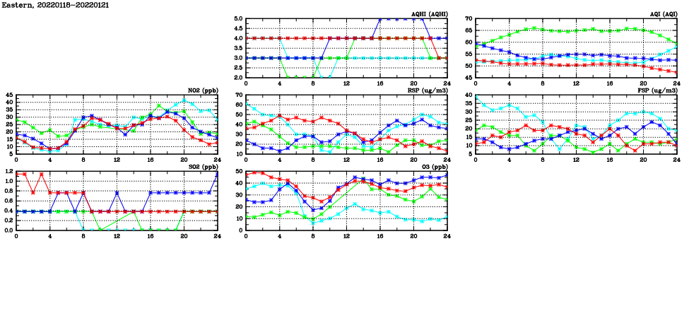 | Air Quality Data Time Series in Eastern (2022/01/21) | ( Line colors: Day -3 Day -2 Day -1 Current day ) | 2D Map Current AQHI |