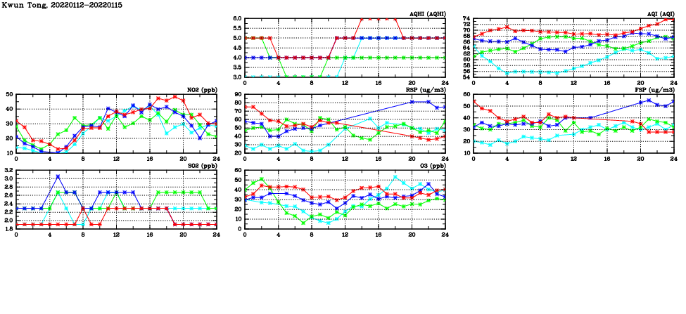 | Air Quality Data Time Series in Kwun Tong (2022/01/15) | ( Line colors: Day -3 Day -2 Day -1 Current day ) | 2D Map Current AQHI |