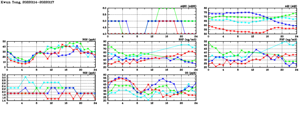 | Air Quality Data Time Series in Kwun Tong (2022/01/17) | ( Line colors: Day -3 Day -2 Day -1 Current day ) | 2D Map Current AQHI |