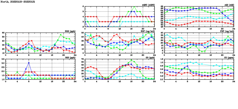 | Air Quality Data Time Series in North (2022/01/21) | ( Line colors: Day -3 Day -2 Day -1 Current day ) | 2D Map Current AQHI |
