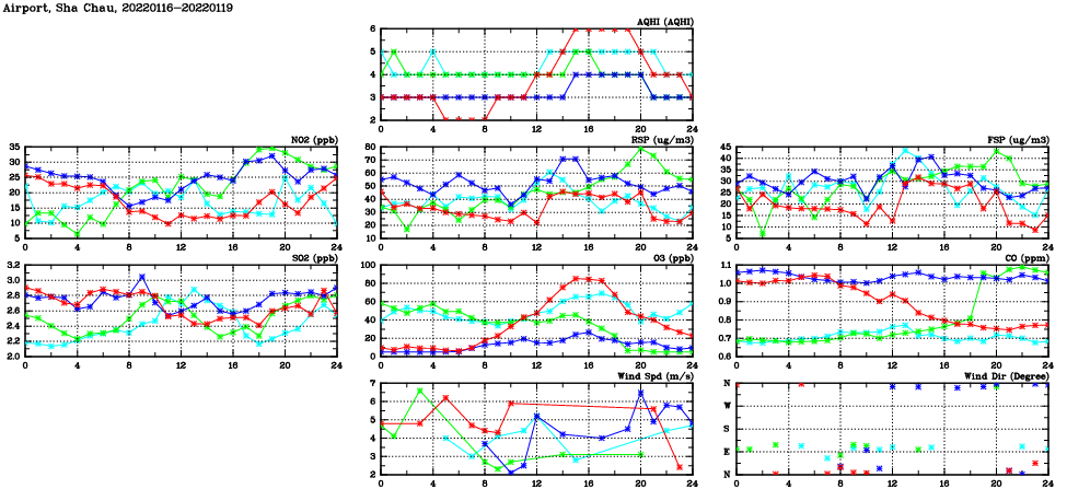 | Air Quality Data Time Series in Airport, Sha Chau (2022/01/19) | ( Line colors: Day -3 Day -2 Day -1 Current day ) | 2D Map Current AQHI |