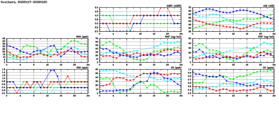 | Air Quality Data Time Series in Southern (2022/01/20) | ( Line colors: Day -3 Day -2 Day -1 Current day ) | 2D Map Current AQHI |
