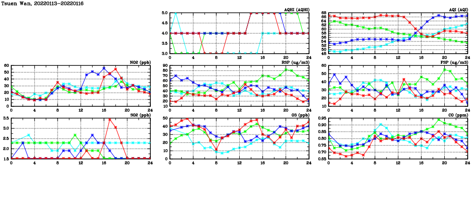 | Air Quality Data Time Series in Tsuen Wan (2022/01/16) | ( Line colors: Day -3 Day -2 Day -1 Current day ) | 2D Map Current AQHI |