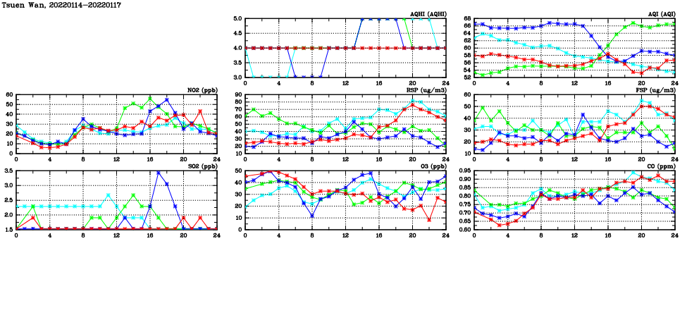 | Air Quality Data Time Series in Tsuen Wan (2022/01/17) | ( Line colors: Day -3 Day -2 Day -1 Current day ) | 2D Map Current AQHI |