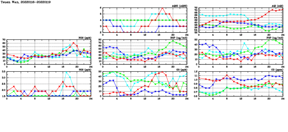 | Air Quality Data Time Series in Tsuen Wan (2022/01/19) | ( Line colors: Day -3 Day -2 Day -1 Current day ) | 2D Map Current AQHI |