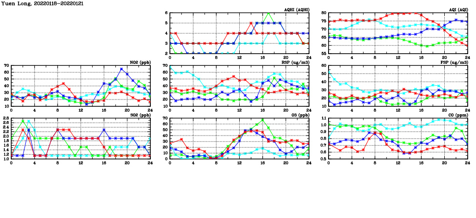 | Air Quality Data Time Series in Yuen Long (2022/01/21) | ( Line colors: Day -3 Day -2 Day -1 Current day ) | 2D Map Current AQHI |