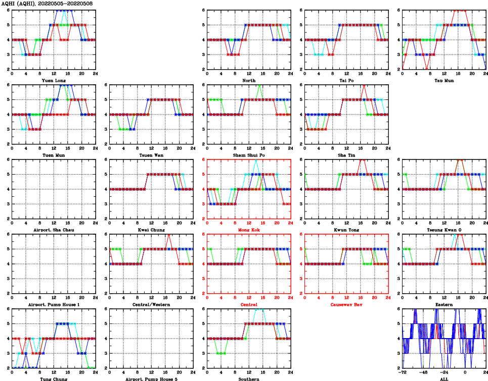 | Air Quality Data Time Series for AQHI (2022/05/08) | ( Line colors: Day -3 Day -2 Day -1 Current day ) | 2D Map Current AQHI |