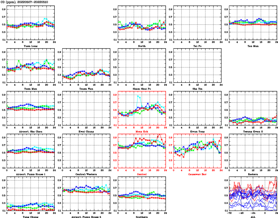 | Air Quality Data Time Series for CO (2022/05/10) | ( Line colors: Day -3 Day -2 Day -1 Current day ) | 2D Map Current AQHI |