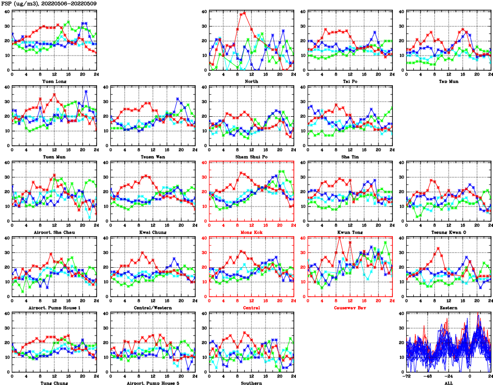 | Air Quality Data Time Series for FSP (2022/05/09) | ( Line colors: Day -3 Day -2 Day -1 Current day ) | 2D Map Current AQHI |