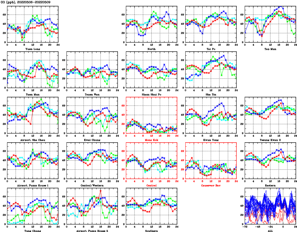 | Air Quality Data Time Series for O3 (2022/05/09) | ( Line colors: Day -3 Day -2 Day -1 Current day ) | 2D Map Current AQHI |