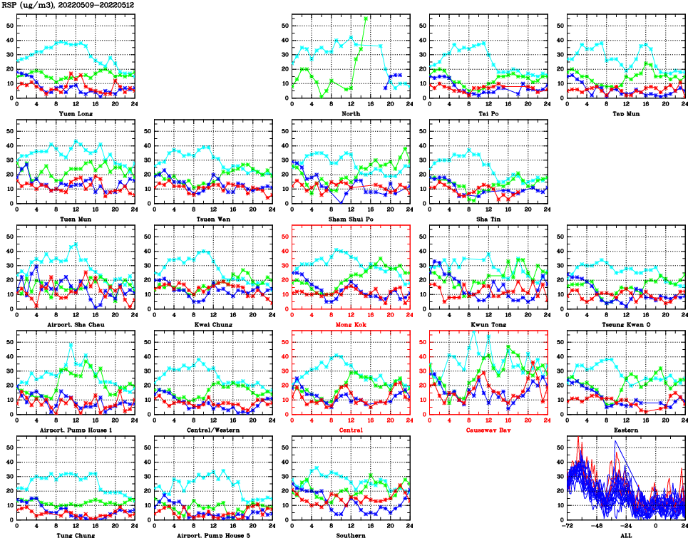 | Air Quality Data Time Series for RSP (2022/05/12) | ( Line colors: Day -3 Day -2 Day -1 Current day ) | 2D Map Current AQHI |