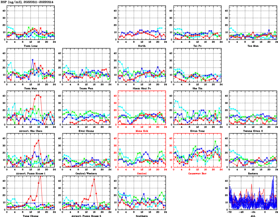 | Air Quality Data Time Series for RSP (2022/05/14) | ( Line colors: Day -3 Day -2 Day -1 Current day ) | 2D Map Current AQHI |
