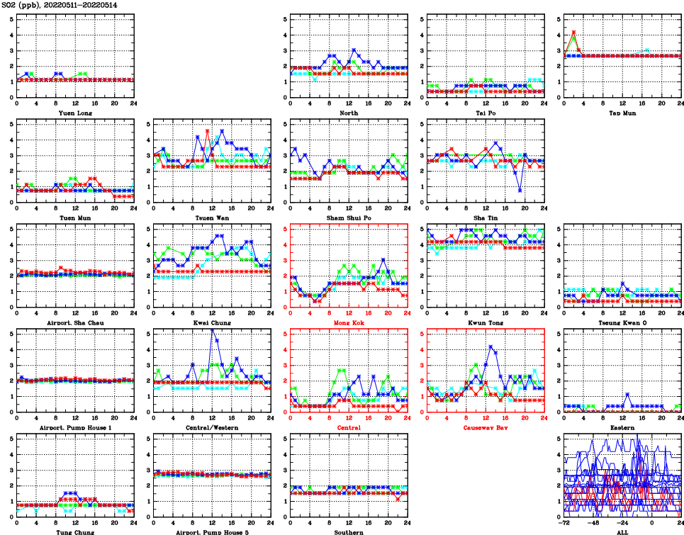 | Air Quality Data Time Series for SO2 (2022/05/14) | ( Line colors: Day -3 Day -2 Day -1 Current day ) | 2D Map Current AQHI |